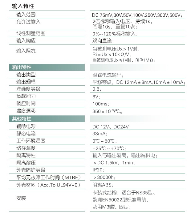 本產(chǎn)品采用頻率調(diào)制和光電隔離原理,對(duì)電網(wǎng)或電路中的雙向直流電壓進(jìn)行實(shí)時(shí)測量,將其變換為平移零點(diǎn)的雙極性跟蹤電流(IG)輸出;具有高精度、高隔離、低功耗、低漂移、快響應(yīng)時(shí)間、寬溫度范圍等特點(diǎn)。本產(chǎn)品采用卡裝式結(jié)構(gòu),端子接線,安裝方便。適用于雙向直流電壓的隔離跟蹤測量。